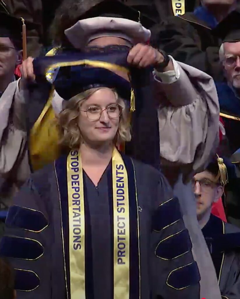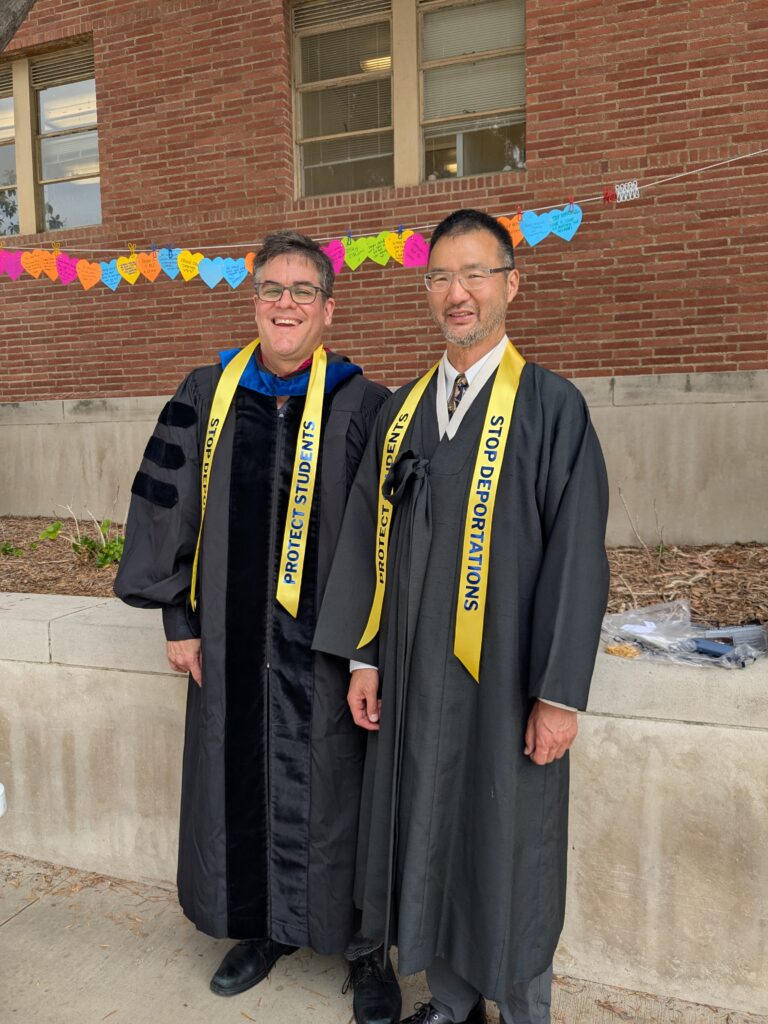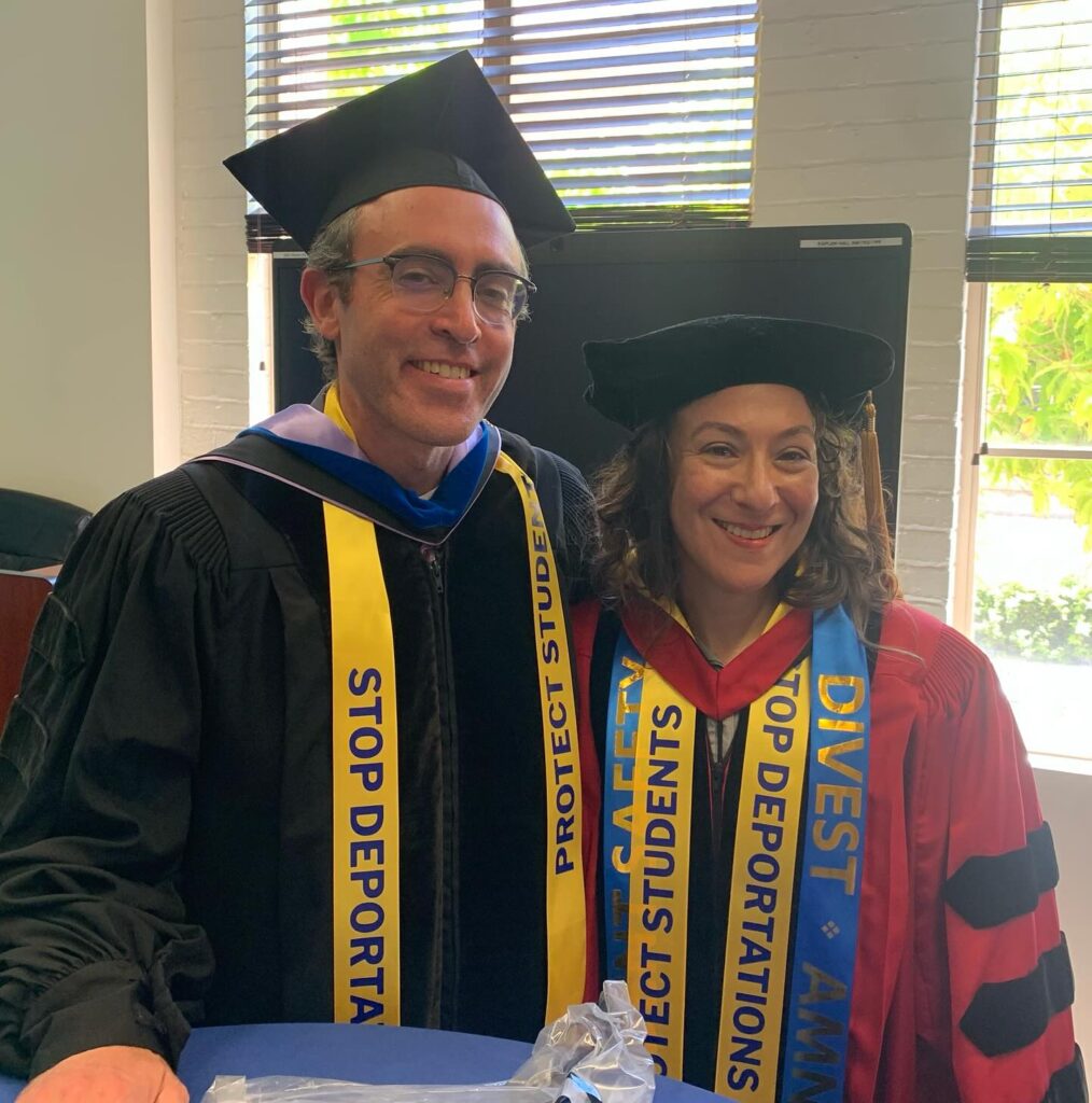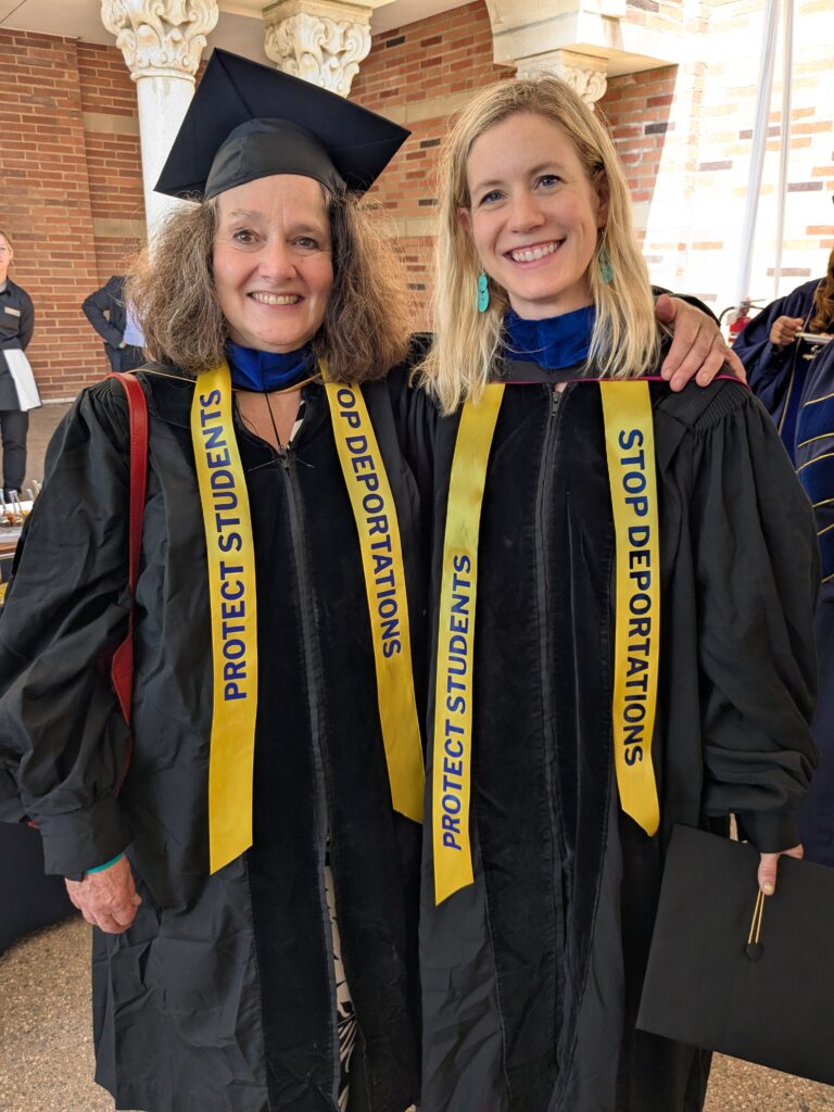For faculty and students to wear at commencement, we made roughly 200 stoles stating “Stop Deportations/Protect Students.”