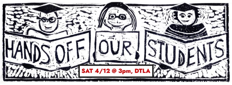 A woodcut-like image of academics wearing glasses and regalia, holding signs showing the words "Hands Off Our Students". Below, in red is the text "Sat 4/12 at 3pm, DTLA".