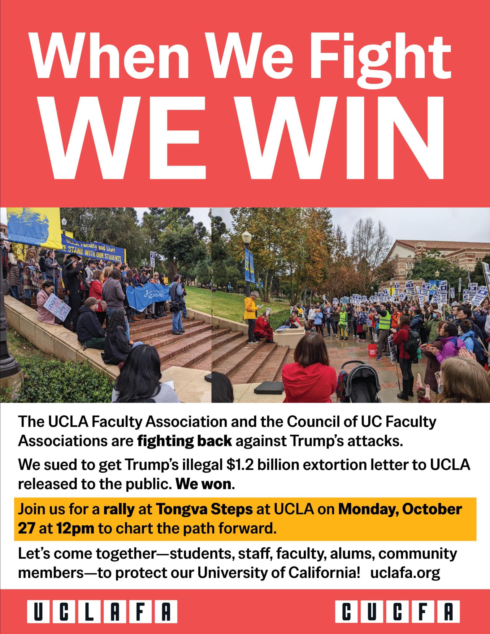 On October 12, 2025, we held a rally on the Tongva Steps to strategize future efforts given our successful legal effort to get the UC to release the Trump “demand letter.” The UC had gone to extensive efforts, appealing all the way to the Supreme Court of California, to prevent it from being released to the public.
